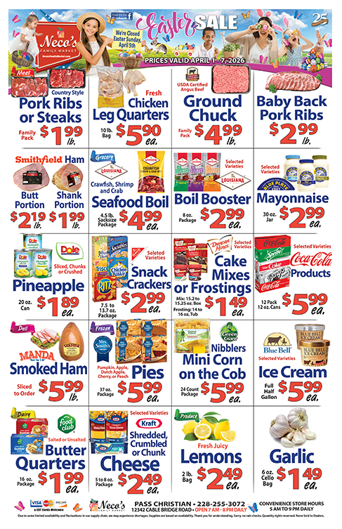 At Neco's, "family" is important to us. It's our way of life and it's part of our name, too. We like to think of our customers as "family". Established by owners Derek and Marsha Necaise in 1977, our family has been serving area families for over two decades. We're committed to making y our grocery shopping a pleasant experience.